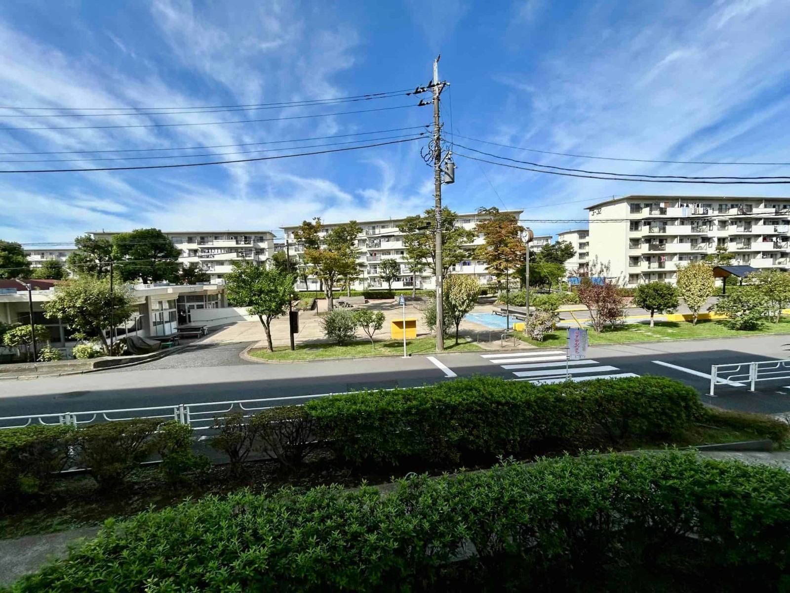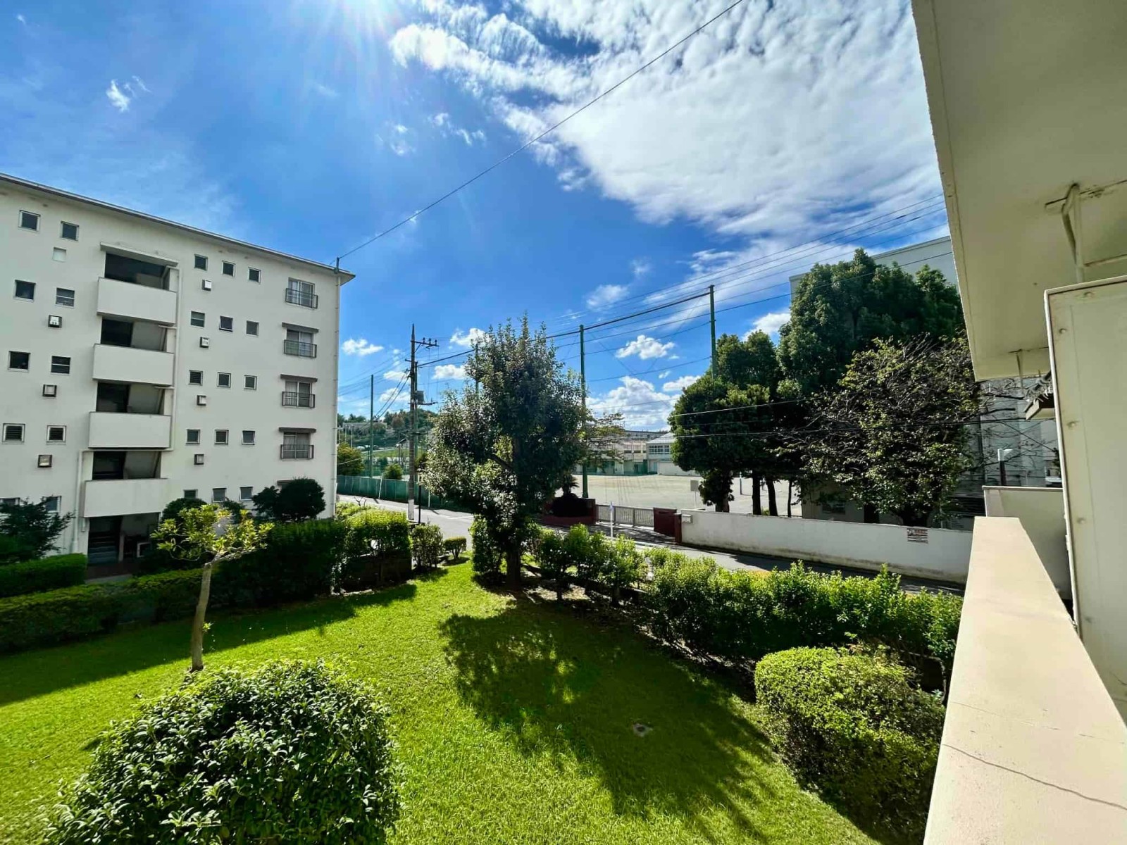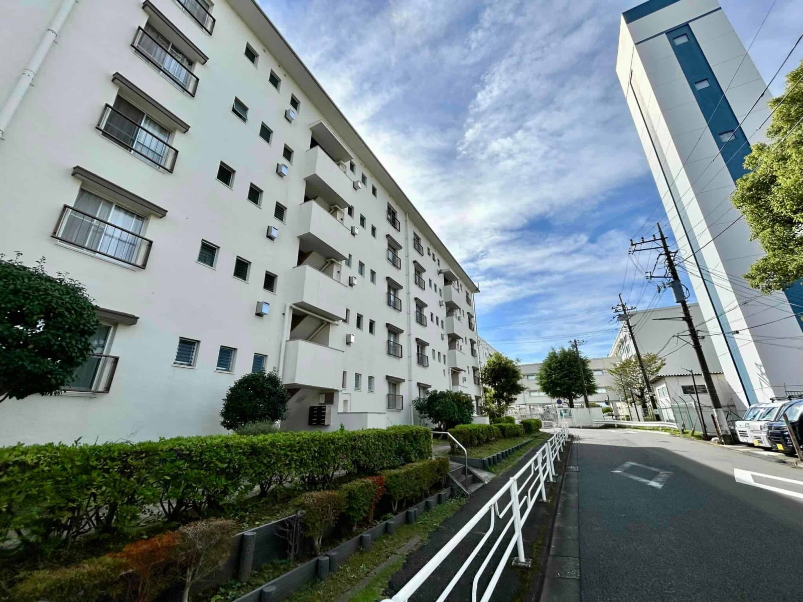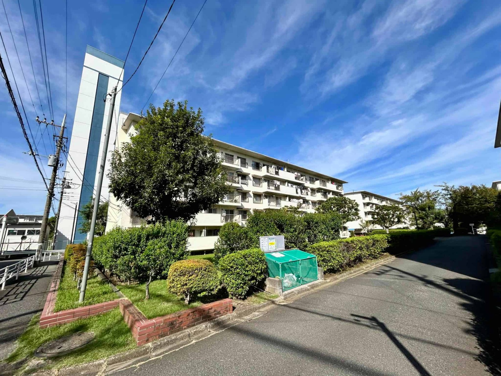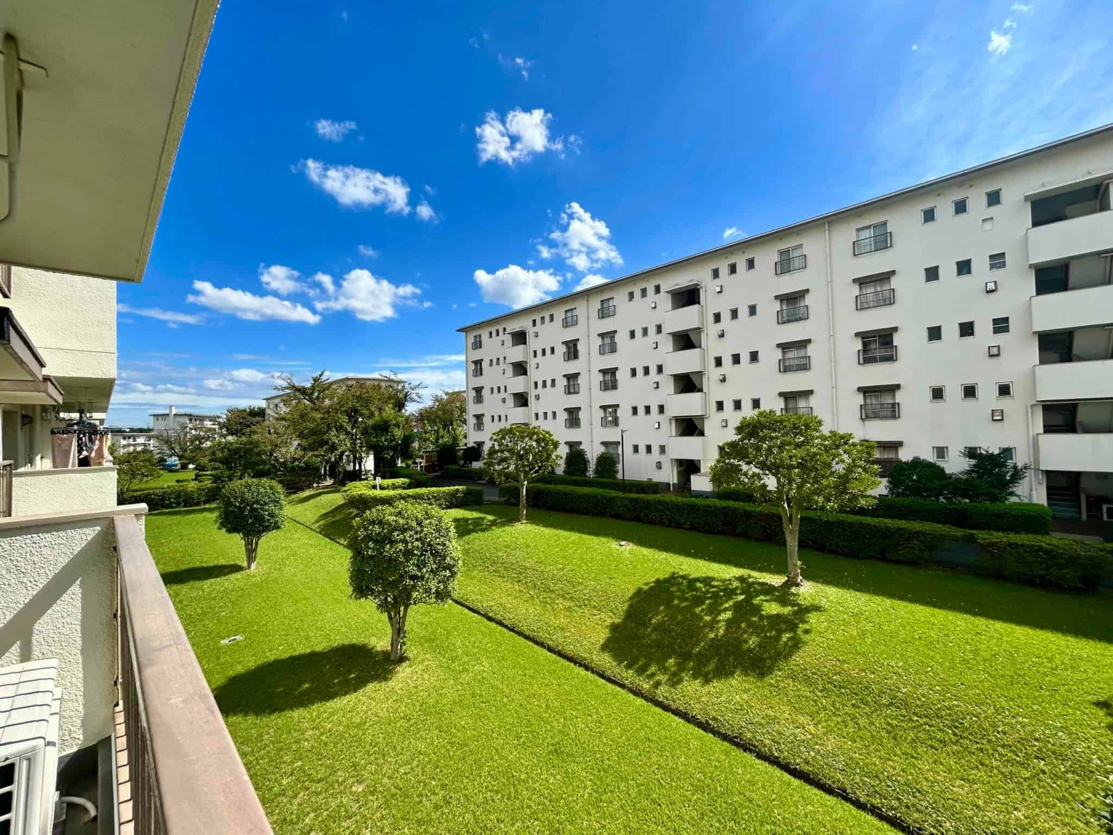 今回バス11分「左近山第二」停徒歩3分の立地の5街区9号棟の2階部分を新規にスケルトンリンベーションいたしました。建物は、南東向きの配列で敷地が広く棟との距離があるため採光や通風を確保しやすい配置となっています。